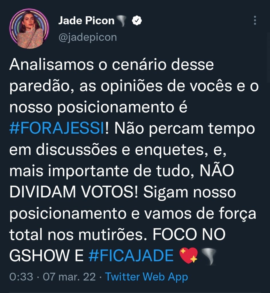No início da madrugada desta segunda (07), após a formação do paredão entre Jessilane, Jade Picon e Arthur Aguiar, a equipe responsável pelas redes sociais de Jade Picon infringiu uma regra ao pedir votos para influenciadora digital ficar.
