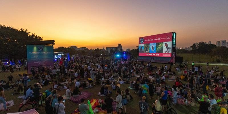 As sessões de cinema acontecem das 19h às 21h30, ao ar livre, no gramado do Parque Villa-Lobos, em um telão de LED de 100 m², criando uma experiência imersiva que conecta público, cidade e cinema em um mesmo espaço.