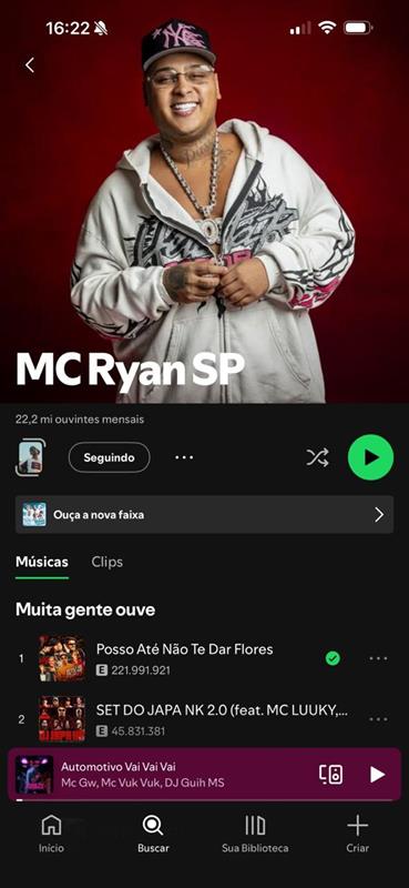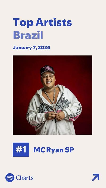 Com 22,2 milhões de ouvintes mensais, MC Ryan SP inicia 2026 no topo da música brasileira e internacional. O artista ocupa atualmente a 1ª posição entre os mais ouvidos do Brasil no Spotify, atravessando um dos momentos mais emblemáticos de sua trajetória e reafirmando o funk como força central da indústria musical contemporânea.