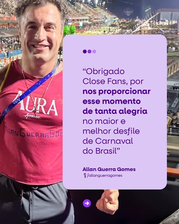 Encerrando o ciclo de ativações, o Close Fans marcou presença no Desfile das Campeãs, com o criador Gabriel Leão realizando entrevistas com influenciadores e personalidades, ampliando ainda mais a visibilidade da marca e reforçando sua conexão direta com o ecossistema de creators.