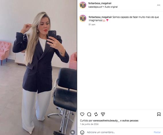 Fernanda Barbosa construiu sua trajetória com base em qualidade, inovação e atendimento personalizado. Cada cliente recebe um acompanhamento exclusivo, desde a escolha dos fios até a manutenção do mega hair. O resultado é uma experiência única, que une beleza, autoestima e bem-estar.