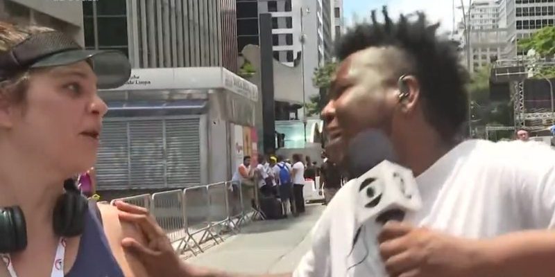 Durante a cobertura da Corrida de São Silvestre, o repórter Thiago Simpatia, que estava super concentrado na entrada ao vivo, acabou dando um “chega pra lá” na atriz, que participou da maratona e queria falar com os apresentadores do programa.